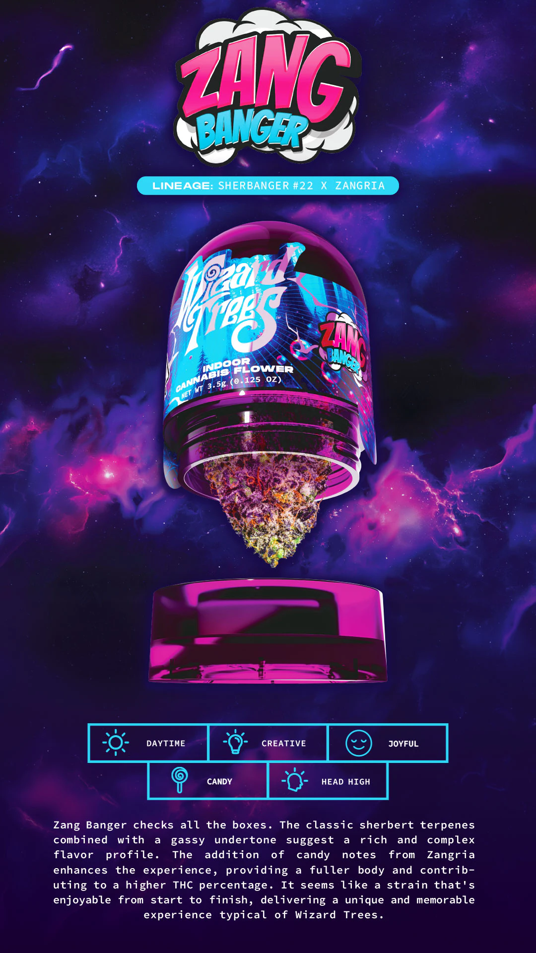 Zangbanger from Wizard Trees delivers a top-shelf terpene profile combining classic sherbanger notes with sweet blueberry and layered candy complexity.
